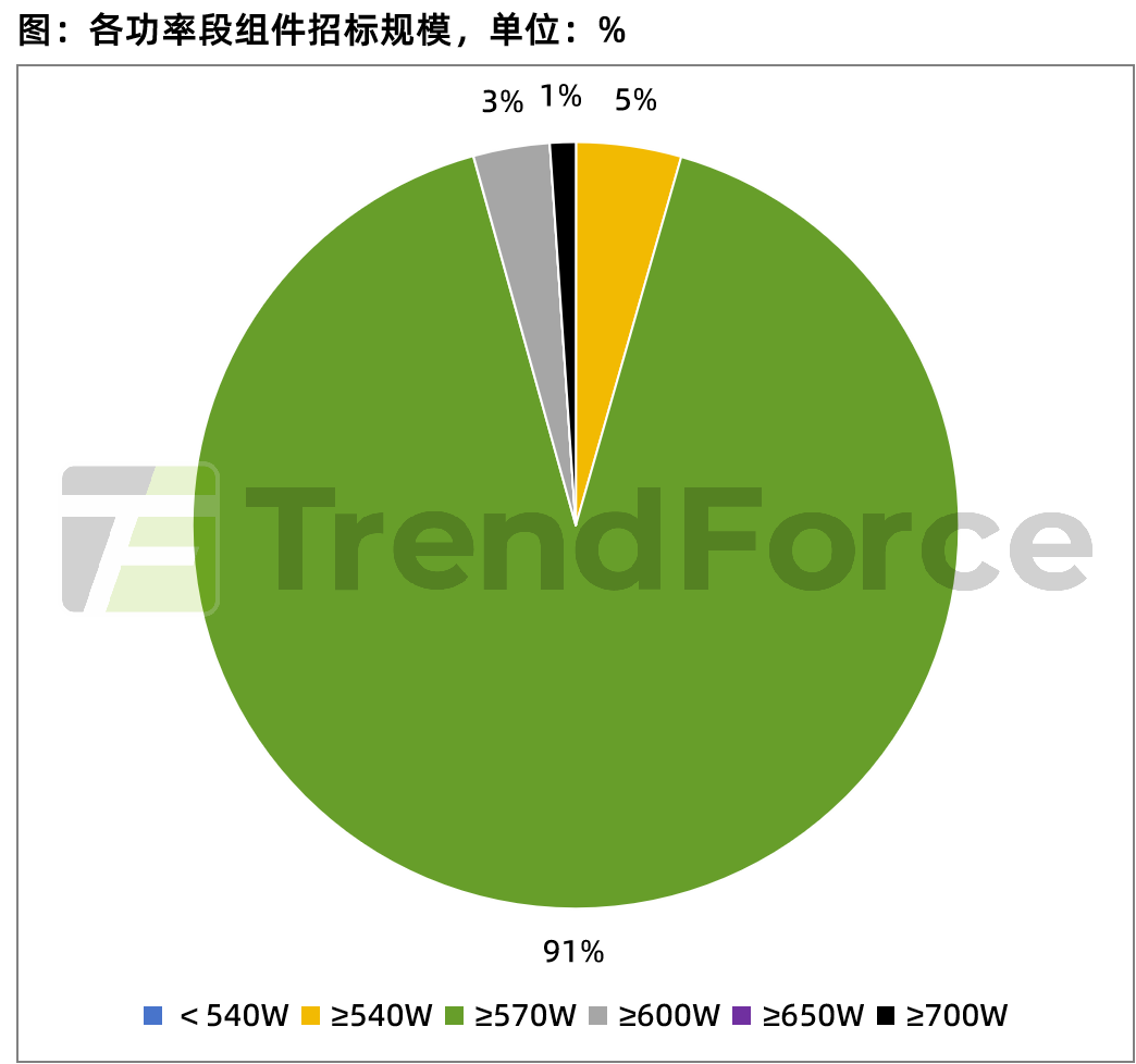 从功率上看,目前组件招标功率基本在580W及以上。据TrendForce集邦咨询不完全统计,2025年H1 580W及以上组件招标规模约71.1GW,占整体招标量的91%,600W以上的组件招标规模2.5GW,占整体招标量的3%;700W以上的组件招标规模843MW,占整体招标量的1%,且610W/700W组件招标需求有逐渐增加趋势。