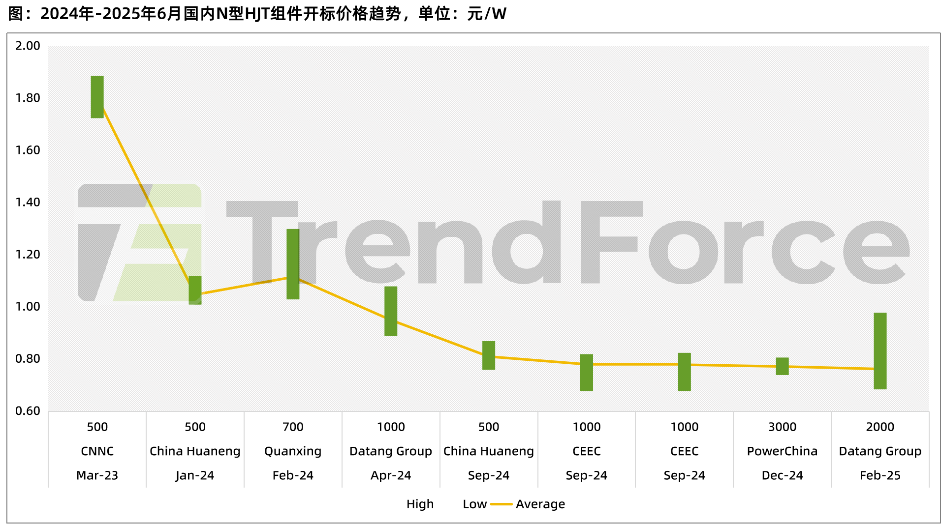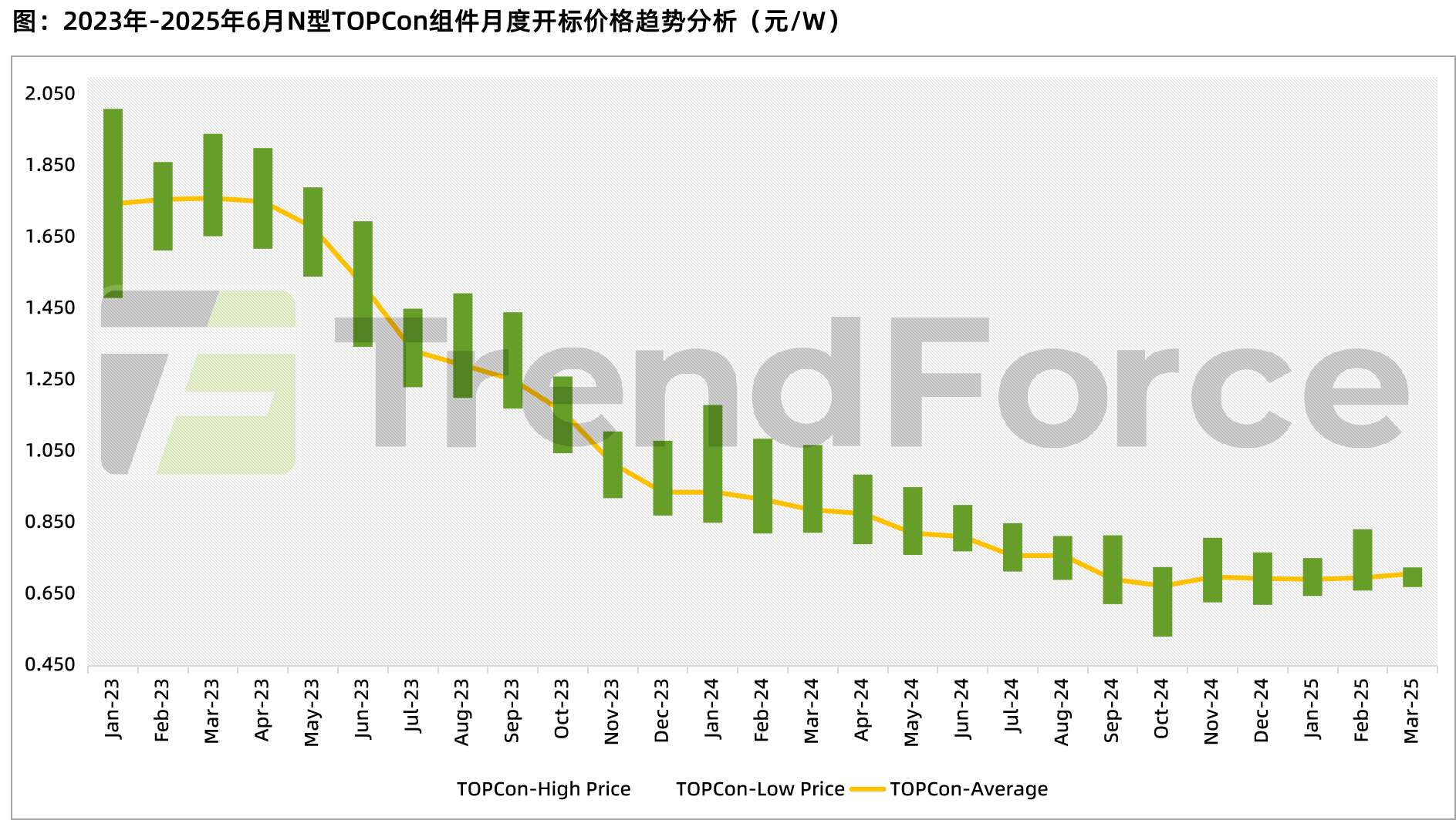 2025年H1 N型TOPCon组件价格先涨后跌。2025年Q1,受政策空窗期影响,抢装需求旺盛,N型TOPCon组件开标价格逐渐回暖,由1月0.692元/W持续上涨到3月的0.707元/W;而抢装需求结束后,市场转为平淡,2025年Q2无大型集采项目开标,仅从中标价格上看,N型TOPCon组件价格逐步下降,由4月的0.702元/W下降到6月的0.700元/W。