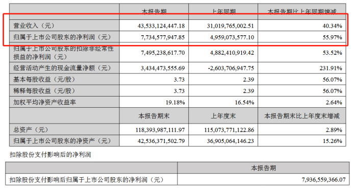 报告显示,上半年实现营业收入435.33亿元,同比增长40.34%;实现归属于上市公司股东的净利润77.35亿元,同比大增55.97%,营收及净利润均为有史以来的最高值。