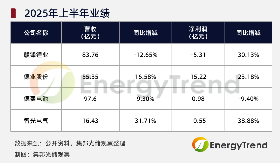 集邦光储观察获悉,近期,赣锋锂业、德业股份、德赛电池、智光电气相继发布其2025年上半年业绩报告。